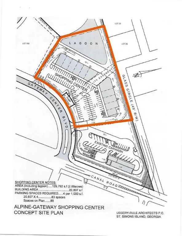 The Property being offered are two lots consisting of 1.762 acres and 1.133 acres totaling 2.895 acres. The lots can be bought separately or together. Ussery-Rule Architects PC has designed a proposed shopping center on both lots which would yield 20,807 square feet as shown on the attached site plan. It is located in what is considered the primmest new commercial area in Glynn County due to the fact that it is contiguous to Canal Crossing a 545,253 +/- shopping center anchored by Sams Club.