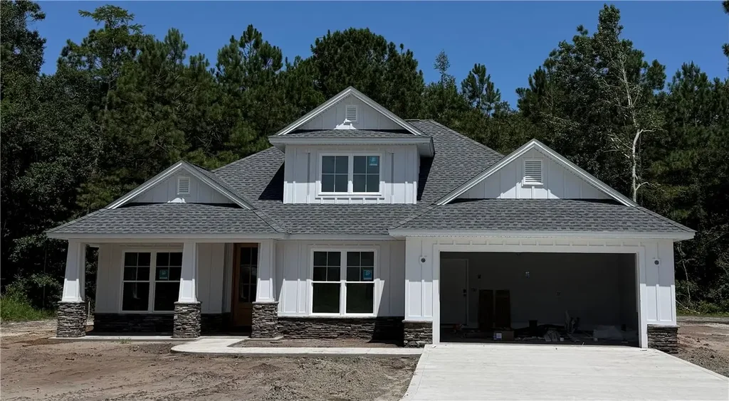 This beautiful 4 bedroom, 2 bathroom board and batten home has a double garage with opener and 2 remotes. It has a masonry foundation finish at front and masonry column bases at front columns. This house has 30 year architectural shingles. The foyer has a 10' ceiling and the remainder of the house has 9' ceilings. This home features custom recessed panel painted cabinets in bathrooms, kitchen, and laundry room. There are beautiful solid surface countertops in the kitchen and bathrooms. The main bathroom is complete with a garden tub and a separate tile shower with glass enclosure. The kitchen, dining room, foyer, great room and main bedroom are finished with 4 5/8" crown molding. Carriage lamps and carriage style garage door trim included. Ceiling fans are included at the great room, bedrooms, and back porch. There is a front porch, rear porch and a grilling pad in rear.