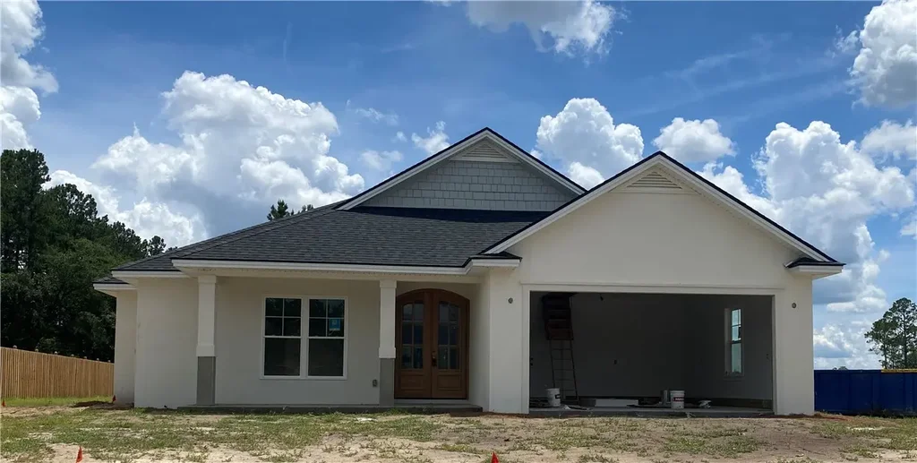 This beautiful 3 bedroom, 2 bathroom home with a double garage is located in Sweetwater at Golden Isles Subdivision. It is being built by Driggers Homes and includes custom cabinets in the bathrooms, laundry room, and kitchen. Other interior features include solid surface countertops in the kitchen and bathrooms, a walk-in closet at the main bedroom and guest bedrooms, and dual sinks in the main bathroom. The main bathroom will also have a tile shower with glass enclosure and a separate garden tub with tile surround. There will be LED lighting in the great room and main bedroom. This home includes covered front and back porches with a grilling pad. The exterior of the house will be stucco and cement siding with masonry column bases at front porch columns. There will be ceiling fans in the bedrooms, great room, and on the back porch. There will be 10 foot ceilings at the foyer and great room with 9 foot ceilings throughout the rest of the house. This house includes 30 year architectural shingles.