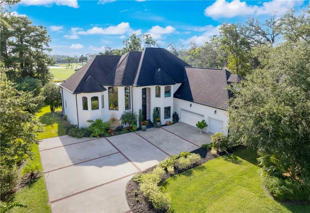 This stunning residence blends timeless European elegance with modern luxury, offering an exceptional lifestyle within the private, gated community of Oak Grove Island. From the moment you approach, the home’s wrought iron double doors and solid concrete construction set the tone for quality and sophistication. Step inside the grand marble-clad foyer, where soaring ceilings, arched openings, and an elegant wrought iron staircase create an immediate sense of scale and refinement. Expansive floor-to-ceiling windows flood the home with natural light, accentuating the travertine and hardwood flooring throughout. The impressive living room features a high-stated fireplace framed by tall windows, offering both warmth and grandeur. Flowing seamlessly from the living room, the newly renovated gourmet kitchen is the heart of the home—designed for both entertaining and everyday comfort. It showcases an oversized island with stunning stone surfaces, abundant custom cabinetry, and two hammered copper sinks, complemented by a third copper sink in the adjoining bar area. A large walk-in pantry provides built-in shelving and cabinetry ideal for appliance and dry-goods storage. The kitchen opens to a breakfast area and a cozy den with sliders leading to the back patio—perfect for enjoying tranquil views of the golf course and the lake’s fountain. The main-level primary suite offers a private retreat with direct access to the patio and hot tub. Its spa-like bath features a separate steam shower, a porcelain-lined oversized shower, a soaking tub, dual vanities with granite countertops, and spacious his-and-hers walk-in closets. A second primary suite on the upper level provides flexibility for guests or multigenerational living, featuring a Juliet balcony that overlooks the picturesque grounds. All bedrooms in this home are ensuite, each designed with its own private entry hall for optimal comfort and privacy. The upper level also includes a large bonus room plumbed for a future bath, a well-appointed office located mid-level between the floors, and a spacious gym positioned over the garage with its own staircase leading to the laundry area. The upper hall opens dramatically to the foyer and living room below, emphasizing the home’s open, airy design. Every inch of this residence has been thoughtfully renovated, combining quality craftsmanship with fine materials throughout. The solid concrete construction ensures long-lasting durability, and the sunset views across the golf course and lake provide a daily reminder of the serene setting that defines life on Oak Grove Island. This home is truly one of a kind—an elegant blend of European inspiration, luxury finishes, and enduring strength.