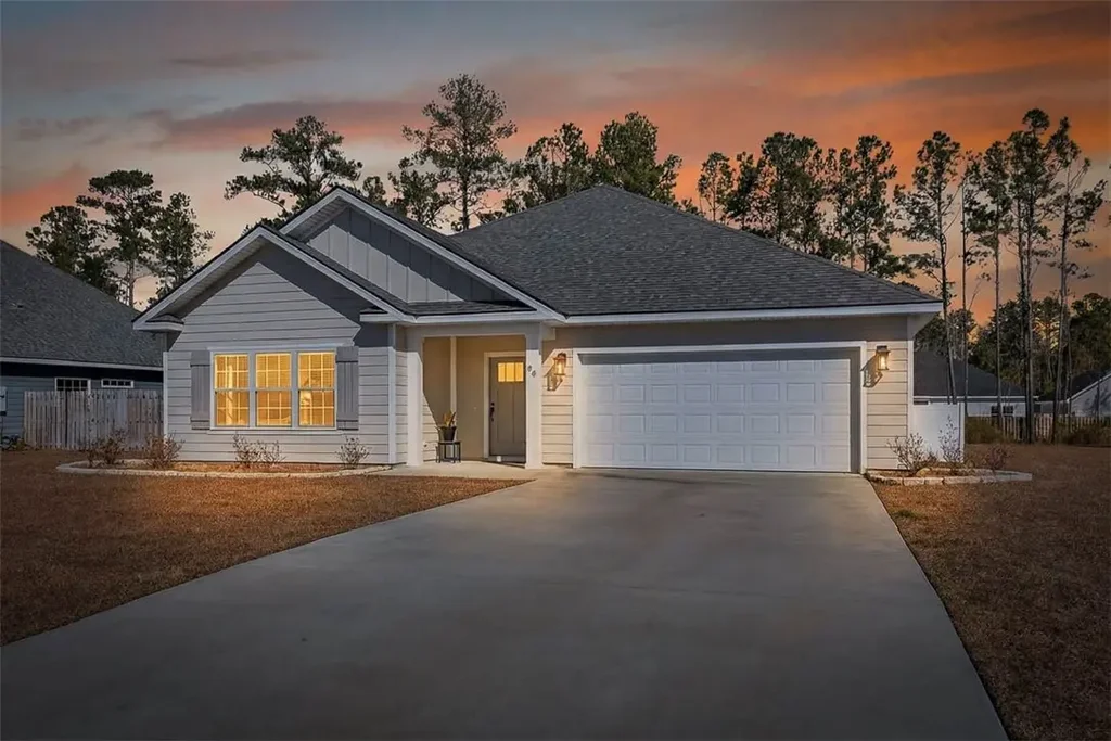 This inviting single-story home offers 3 bedrooms and 2.5 bathrooms across 2,061 heated square feet, thoughtfully designed with an open and airy floor plan. The main living areas and laundry room feature durable LVP flooring, complemented by granite countertops throughout, while plush carpeted bedrooms and tiled baths add comfort and style. The spacious primary suite is a true retreat, showcasing an ensuite bath with dual vanities, a large tiled walk-in shower, a relaxing soaking tub, and a generous walk-in closet. Two well-sized guest bedrooms are served by a full bath and convenient half bath, and a dedicated dining room provides the perfect space for gatherings. Step outside to enjoy the large screened porch finished with shark coating, ideal for year-round enjoyment. Situated on a .25-acre lot with a hardi exterior, this home blends quality construction with everyday functionality in a beautiful setting.